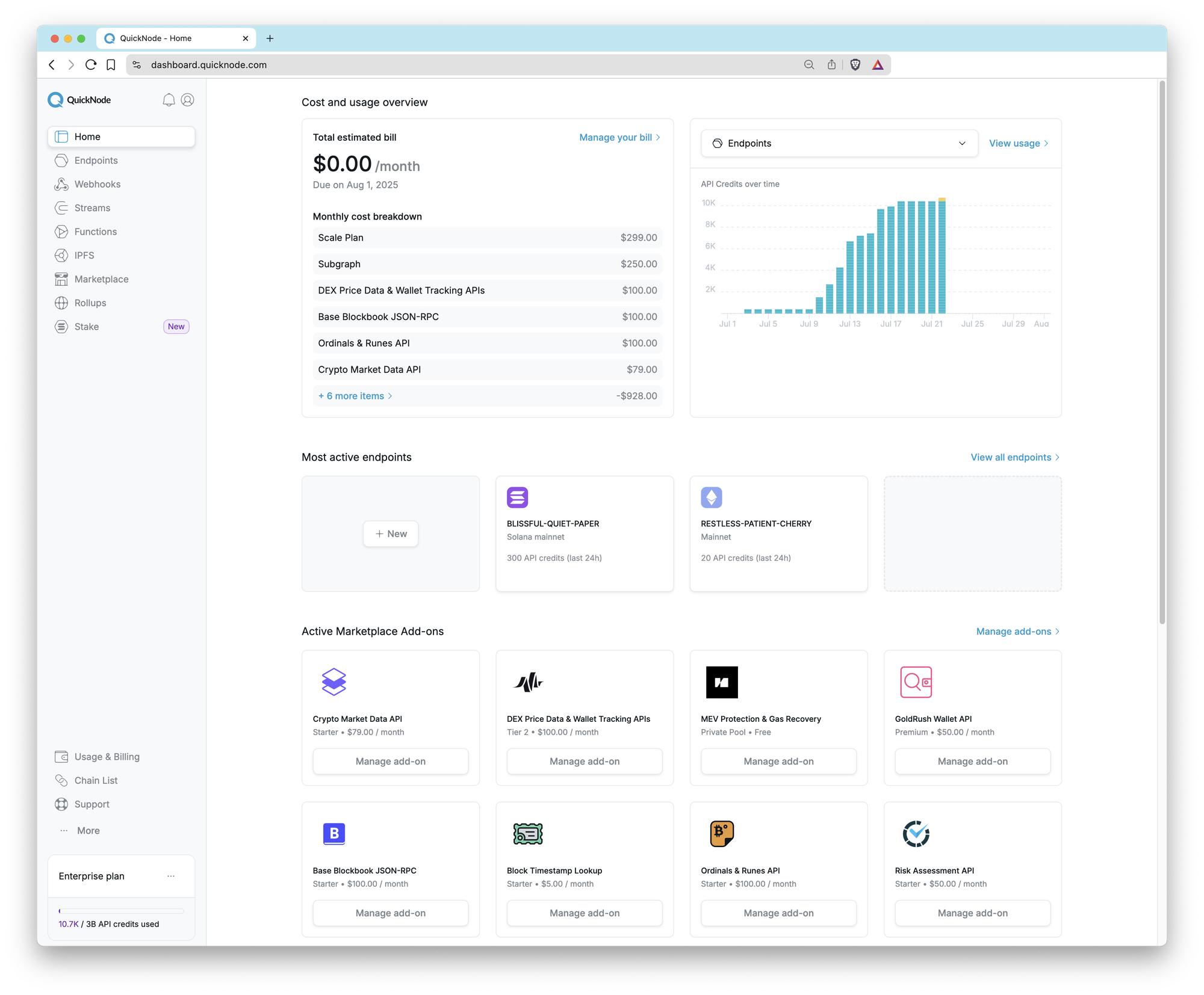 QuickNode is a multi-chain RPC provider supporting Solana alongside 70+ other networks through a unified platform. The core product is reliable RPC node access, with a marketplace offering optional add-ons for additional functionality. The service uses a credit-based pricing model where each plan includes a fixed block of API credits and an RPS ceiling.