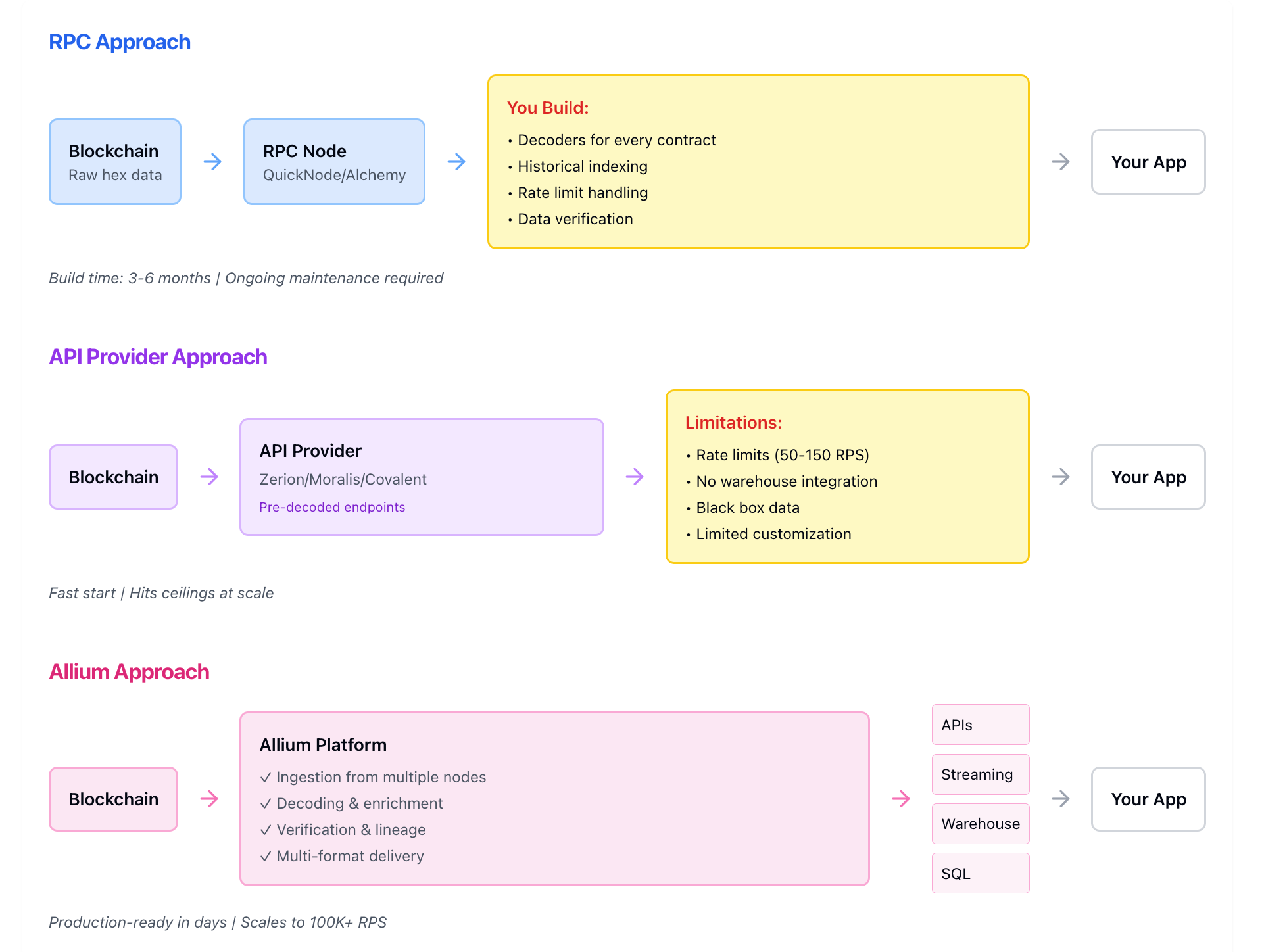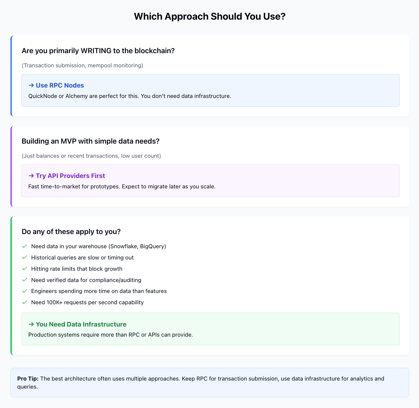 But production systems - especially consumer wallets and trading applications that need verified data at scale - require infrastructure beyond what RPC or APIs provide. The question isn't whether to use RPC or APIs, but when your requirements have outgrown what they can deliver.