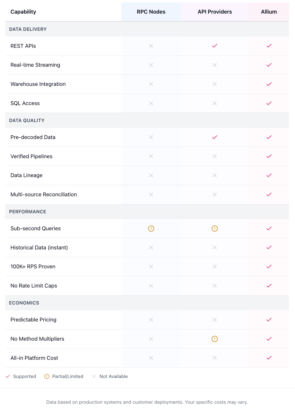 Via Allium's data infrastructure: Streaming data feeds push decoded DEX trades in real-time via Kafka or Pub/Sub. No rate limits. Guaranteed delivery with replay capability if you miss events.