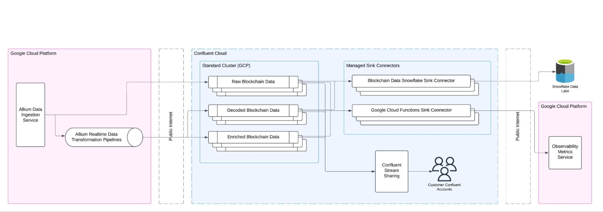These transformation pipelines are subsequently synced to Confluent Cloud, and then sent to Snowflake or a self-built observability service on GCP via fully managed connectors. Allium is also able to share streams of blockchain data directly to customers via Confluent Cloud’s Stream Sharing function; a feature that allows for the secure sharing of real-time streams of data between organizations.