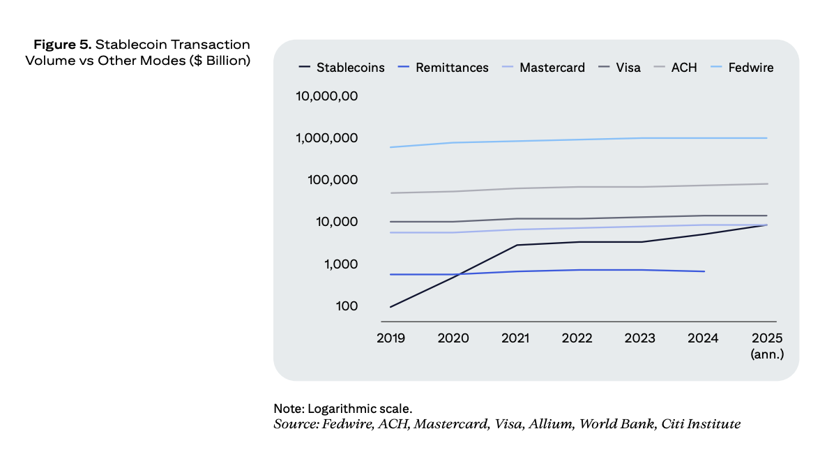 Using Allium’s adjusted on-chain data alongside traditional rails, Citi shows stablecoin transaction volumes approaching roughly $1 trillion per month—now beginning to rival traditional payment networks in scale.